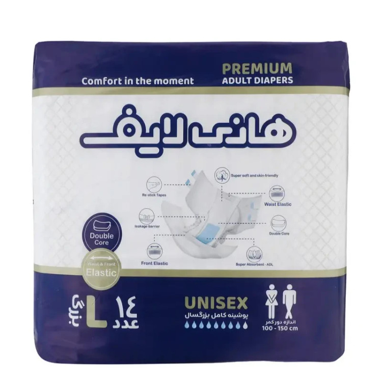 پوشینه بزرگسال هانی لایف سایز بزرگ، مناسب افراد با نیاز به مراقبت ویژه و مدیریت بیاختیاری است. این محصول با قدرت جذب بالا، چسبهای مقاوم و طراحی ارگونومیک، راحتی و محافظت طولانیمدت را فراهم میکند.