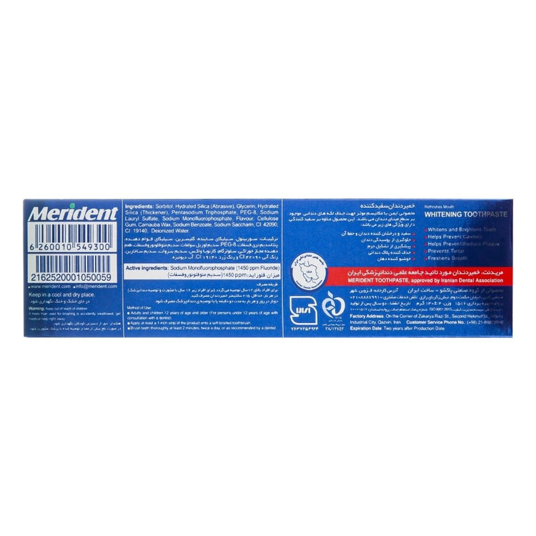 خمیردندان سفید کننده مریدنت محصولی ایمن با مکانیسم موثر، جهت حذف و ممانعت از تشکیل لکه های دندانی موجود بر سطح مینای دندان می باشد. این محصول حاوی ترکیبات ساینده استاندارد، جهت سایش و پولیش مینای دندان (بدون آسیب به آن) بوده و همچنین با دارا بودن ترکیبات موثر فسفات در فرمولاسیون خود، توانایی کاهش لکه های دندانی در درازمدت را دارد. همچنین این محصول با میزان یون فلوراید استاندارد ( ppm1450) ، مانع از پوسیدگی دندان ها می شود و ترکیبات کیلیت کننده فسفاته گنجانده شده در فرمولاسیون آن علاوه بر حذف لکه های دندانی با جذب يون های مزاحم از تشکيل جرم های کلسيته بر روی دندان و تشکیل تارتار که ظاهر ناخوشایند زردی را در کنار بیماری های دندانی ایجاد می کند، جلوگيری می کند.