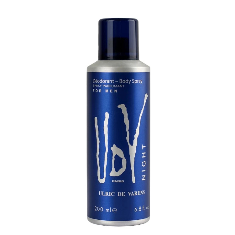 اسپری بدن مردانه نایت یو دی وی محصولی از برند ایرانی یو دی وی است. این محصول یک اسپری دئودورانت و خوشبو کننده بدن بوده که رایحه ای مانند عطر نایت یو دی وی دارد. استفاده از اسپری هایی که رایحه های مشابه عطرها دارند، برای استفاده روزانه، مناسب و به صرفه می باشد. همچنین استفاده همزمان عطر و اسپری، ماندگاری عطر را افزایش می دهد.